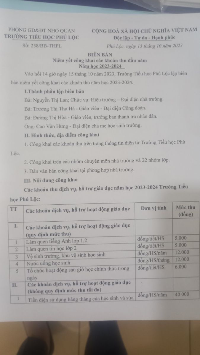 Biên bản niêm yết công khai các khoản thu dầu năm học 2023 – 2024