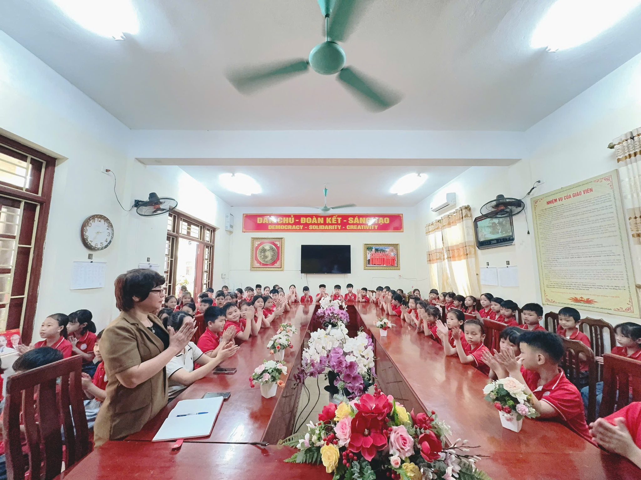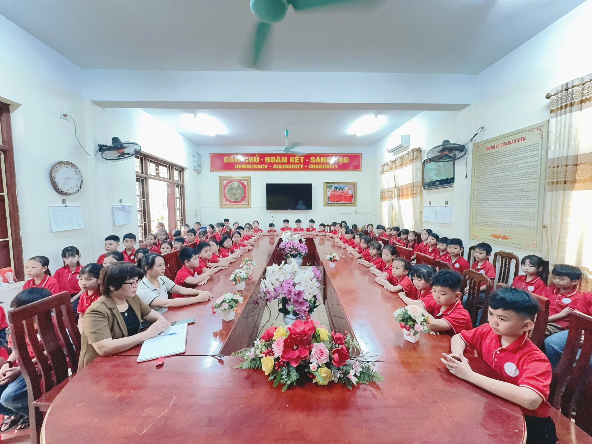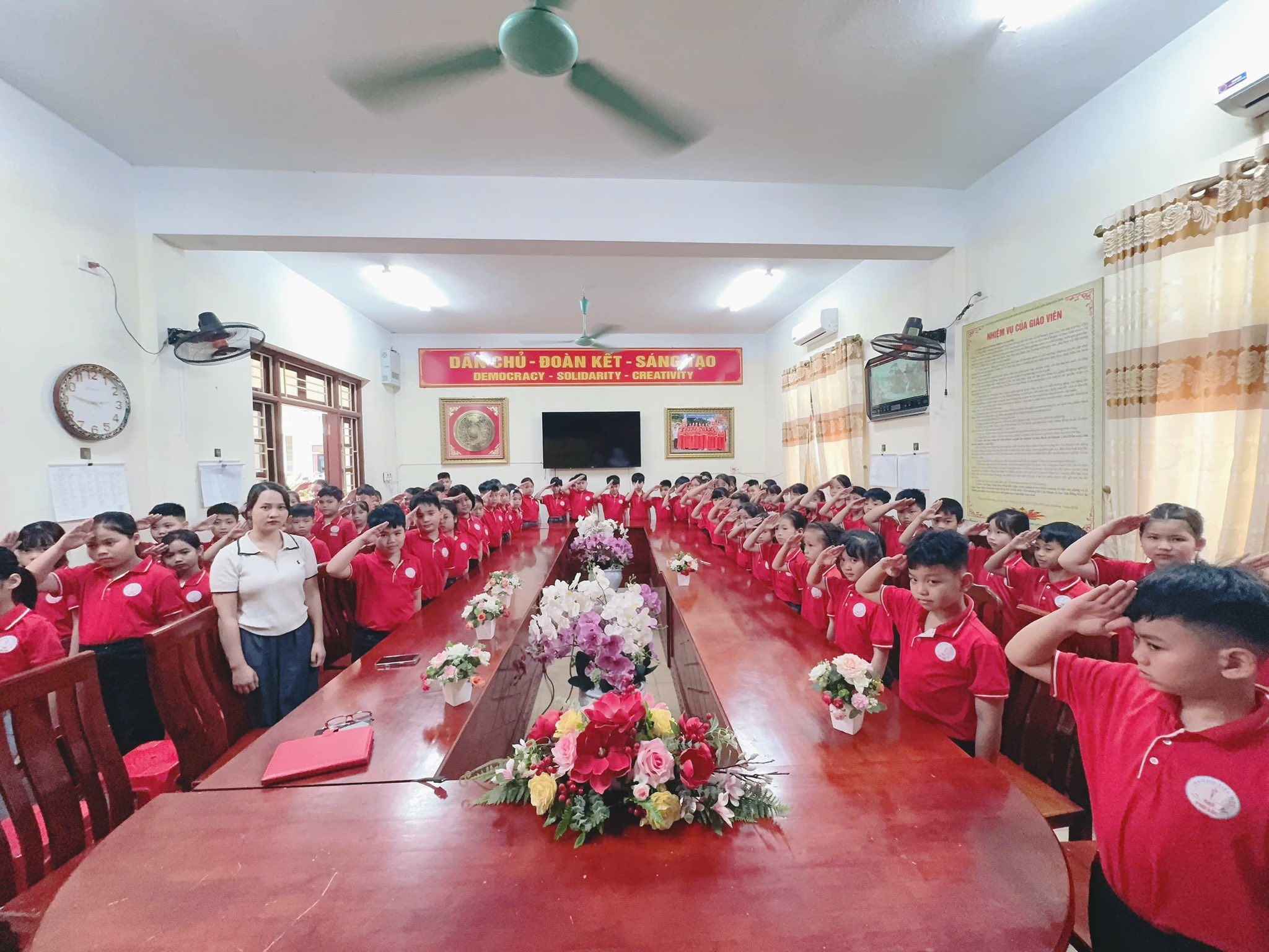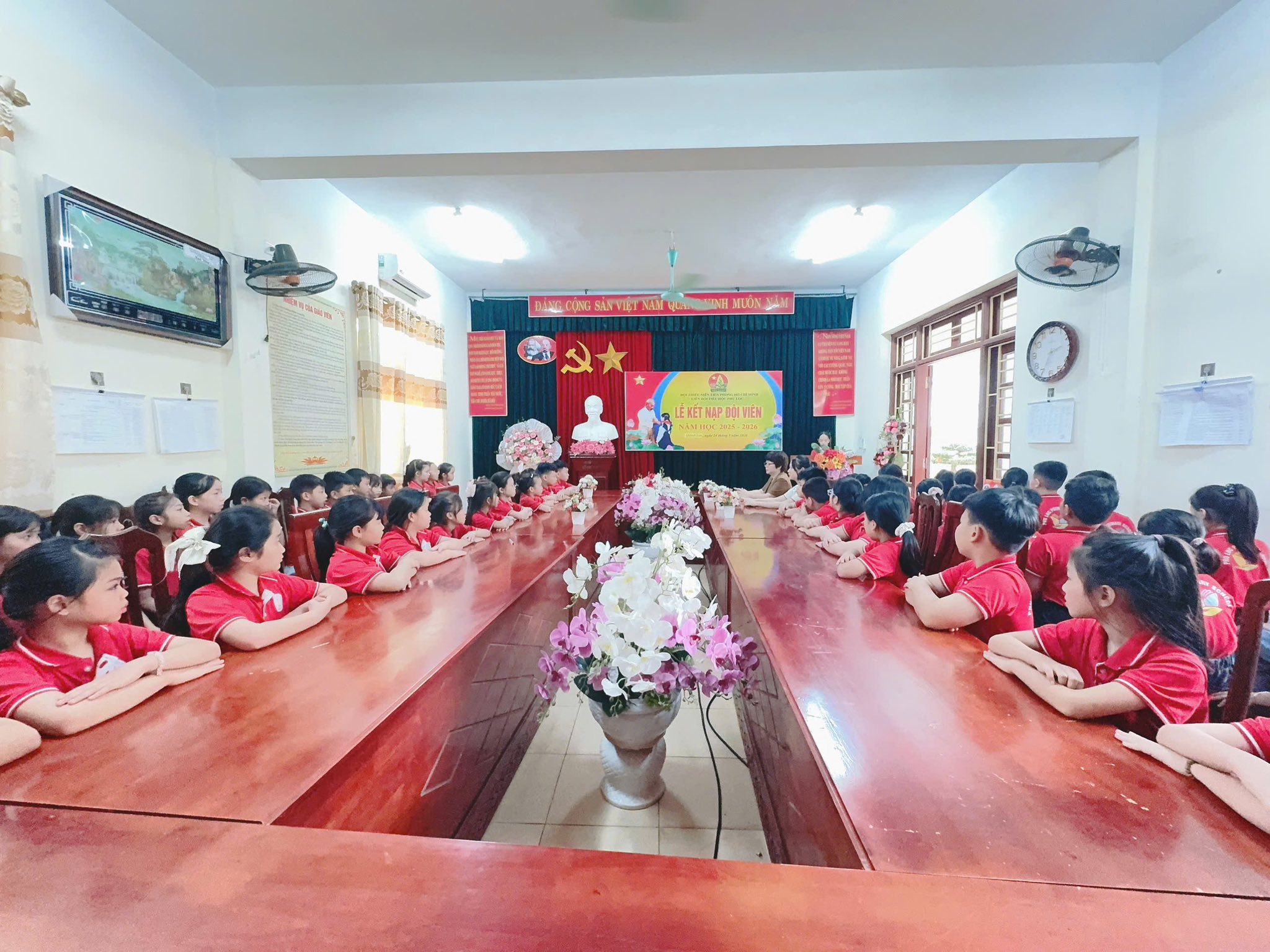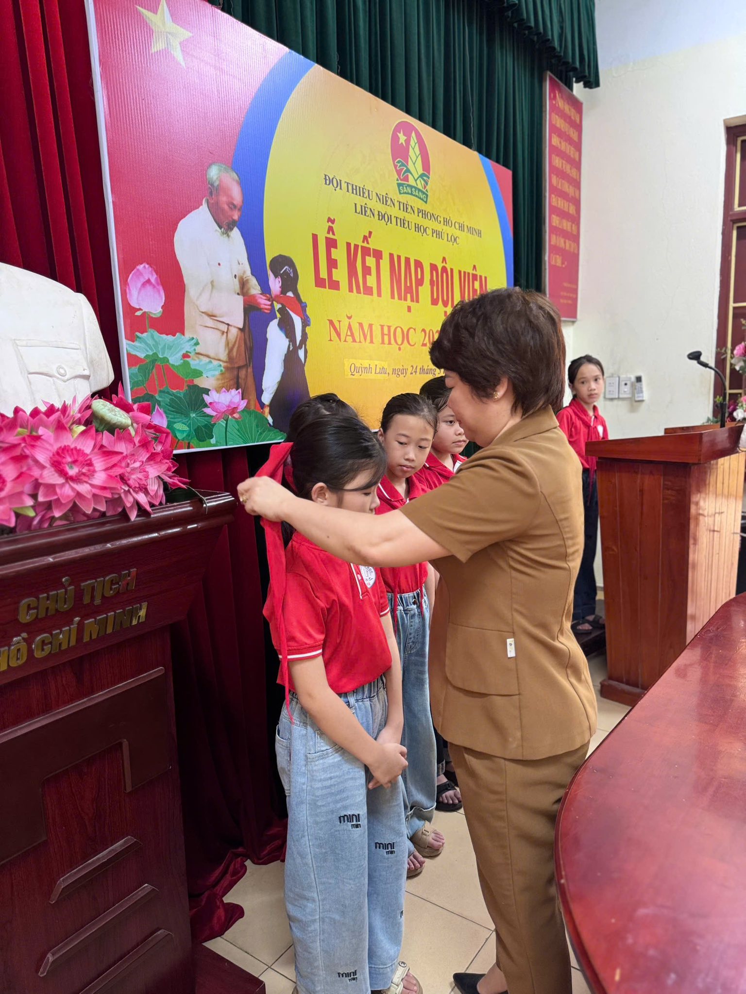 Khoảnh khắc trao khăn quàng đỏ – biểu tượng của niềm tự hào và trách nhiệm – đã để lại nhiều cảm xúc. Chiếc khăn quàng thắm đỏ trên vai không chỉ là niềm vinh dự mà còn là lời nhắc nhở các em luôn cố gắng học tập, rèn luyện, xứng đáng với truyền thống vẻ vang của Đội. Buổi lễ khép lại trong niềm vui, sự xúc động và những tràng pháo tay chúc mừng. Các đội viên mới chính là những hạt giống đỏ, tiếp bước truyền thống, góp phần xây dựng Liên đội ngày càng vững mạnh.